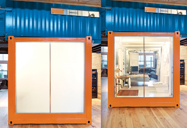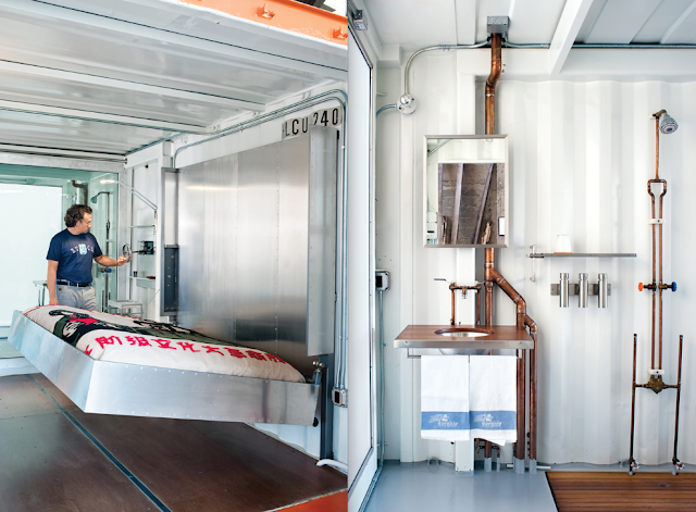 The two had the idea of infusing the containers into the house to create an interesting and edgy atmosphere within the loft: re-purposing  the once transportable cargo crates into a pop-up guest-bedroom, bathrooms, and even an office.  Have a watch at the video (featured top right via Dwell) to get a better sense of this idiosyncratic space, as well as some photos. (featured below).