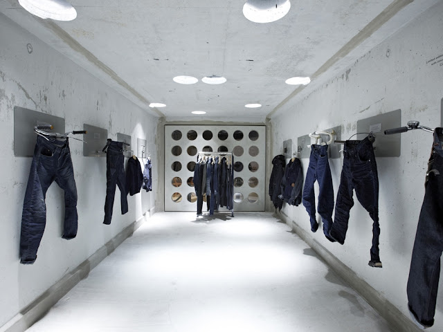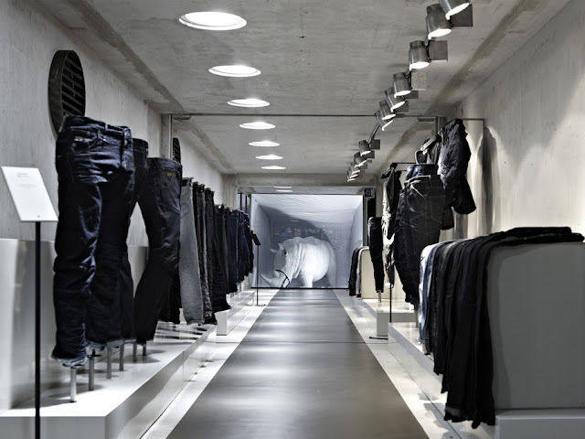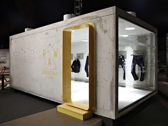 Both of indoor and outdoor exhibitions were built using raw materials such as unfinished wood and cement, gloss yellow pieces and shiny metal flooring. The team filled the interior with white lighting and converted old motorcycle handlebars into innovative hangers for the clothes while adding a white rhino behind glass. The interior design served as a gallery for G-STAR’s unique collection.
