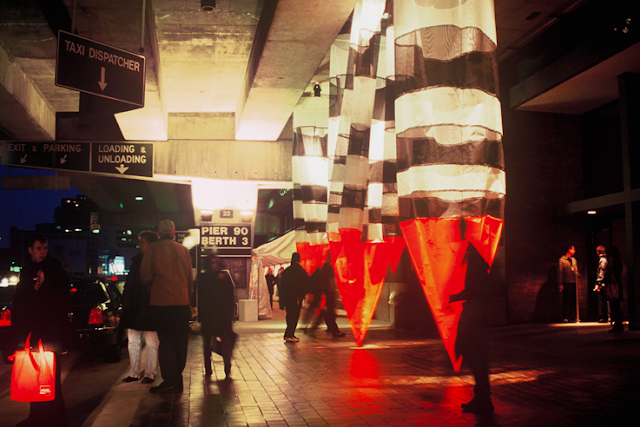 This piece was displayed at New York City’s Westside Highway at Piers 88 and 90 as part of the Armory Show in 2001, beneath the roadside cement overpasses. At night, there was lighting that was installed that made this installation illuminate as city-goers tried to get taxis.