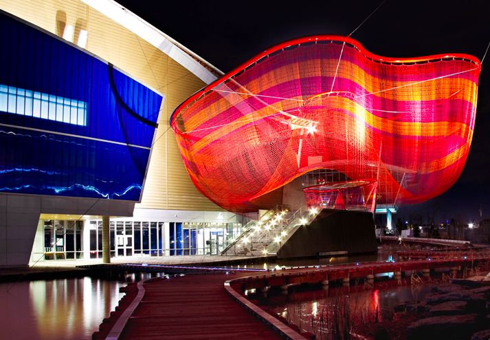 This piece was commissioned for the 2010 Vancouver Winter Olympics and as a permanent fixture for the community. The location of this piece embodies the area it exists in with red-stained cedar that leads you through the art.