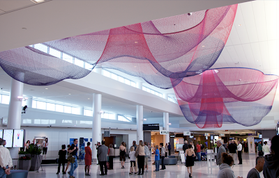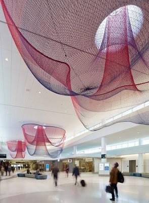 If you’ve been through the San Francisco National Airport as of late, chances are you’ve had the pleasure of viewing Janet Echelman’s newest commission by the Zone of Re-composure Competition: Every Beating Second, 2011 (pictured left).  It occupies three round skylights of the ceiling, where translucent colored netting hangs gracefully, swaying with mechanically made airflow that changes its loose shape. In the evening, the sculpture is transformed with colored lighting—changing from indigo to purple and magenta to red-orange.