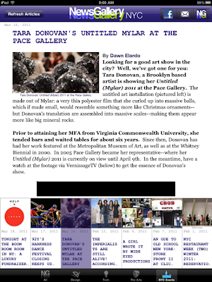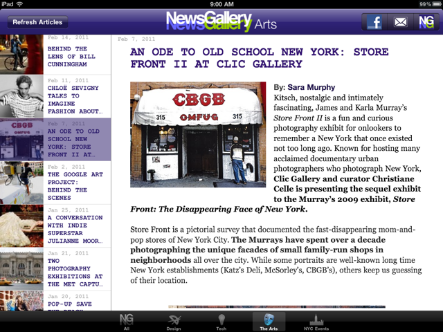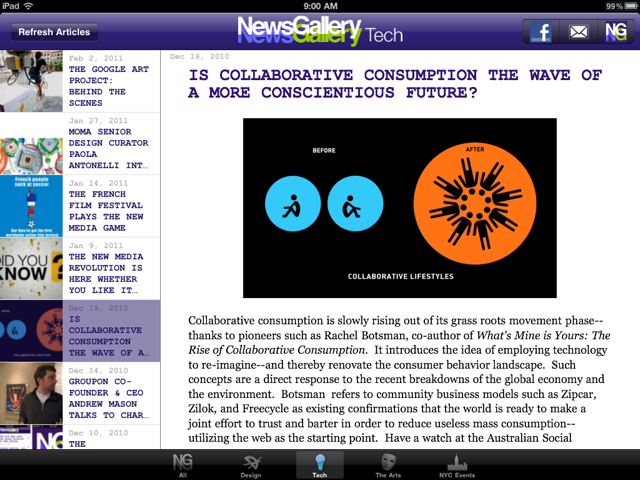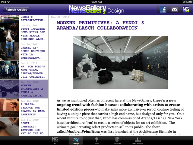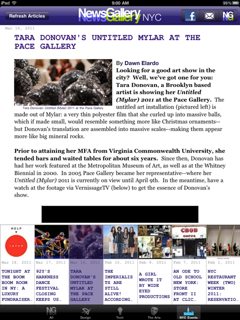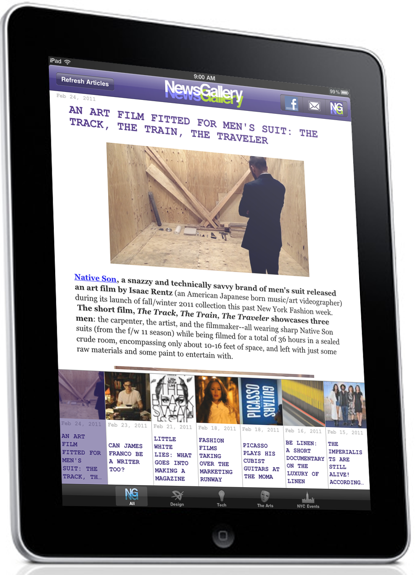 We’ve kept the tabs as is–on the NG iPhone App–categorizing the topics of interest as follows: All, Design, Tech, The Arts, and NYC Events.  We also kept the double click function to enlarge images as on the iPhone app: this way the images aren’t over-dominating the stories being told.  Hence, if you’d like to see an image in a bigger frame: all you have to do is double click–and without even leaving the article the picture becomes bigger to fit your screen.  To go back to the original view: you just have to double click again–and it automatically retracts back to its initial size. Note: we did move the More tab to the top left–residing next to the Facebook and email share buttons, now titled NG–which is different from the NG iPhone version.  (See below).