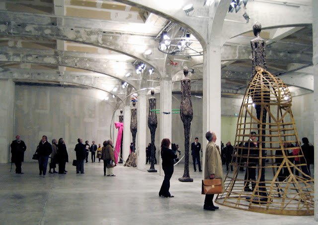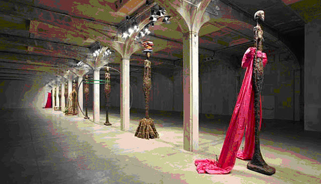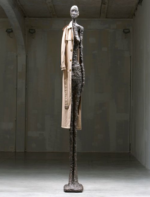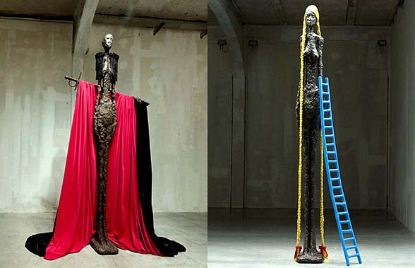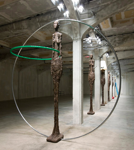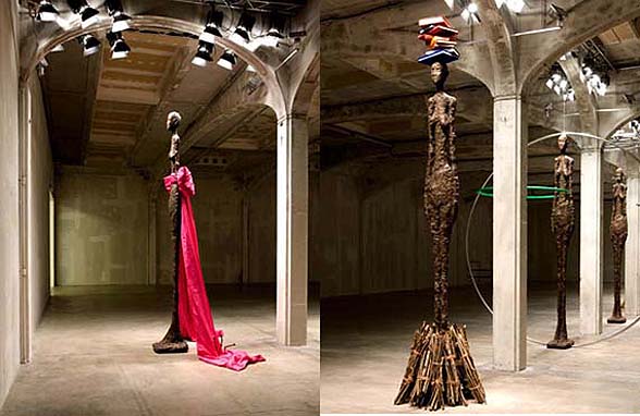 Baldessari’s show is called, The Giacometti Variations: It’s made up of nine facsimile of Giacometti’s usual suspected sculptures.  According to Baldessari, the towering skeletal figures are “intended to emulate real life skeletal models walking down the runway.”