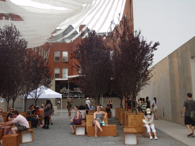 Some of  the past-time decor presently up for play-time at the weekly outdoor party are: about 60 oak trees, ping-pong tables, picnic tables, lounge chairs and benches, a rock-climbing wall, a sandbox, pools, a Foosball table, and many more.  Amongst the residents lucky enough to inherit some of the Modern Art’s PS1’s pieces are the local schools, parks, restaurants and other small business that make LIC what it is today.  Have a look (below) to get a taste of Holding Pattern —currently on view at MoMA’s PS1.