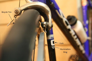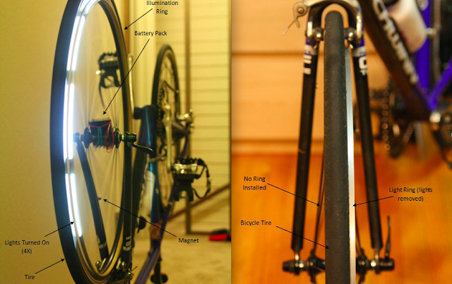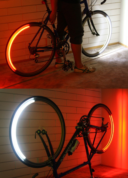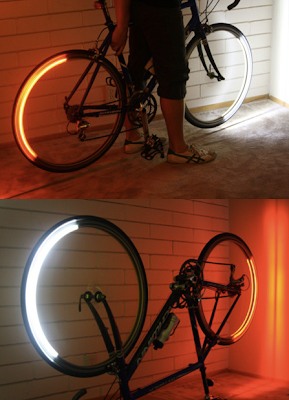 The Revolights bicycle lighting system consists of two thin profile LED rings (white in front, red in back) that mount directly to each wheel rim using a series of rim specific clips. Power is supplied via a thin wire to the hub where a lightweight and slim USB rechargeable battery is held in a special bracket.  Essentially Revolights are revolutionizing bicycle safety and have obviously earned the respect and support of the cycling community.