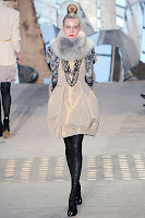 Givenchy also gave us his rendering of the puffy look with this white lacy balloon skirt that projected more of a royal interpretation (right). This regal flared skirt, is also complimented by a matching prominent shoulder to go along with its blue shoulder pads seen beneath the white lace. Lacroix on the other hand, exhibited a much more tamed version in his idea of the inflamed balloon–using neutral colors (below). He tends to capture women in an intensely powerful frame in keeping with his familiar take (echoed from past seasons) on the QueenElizabeth demeanor.