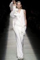 One of the recurring motifs for the Fall 09 fashion collections that launched in Paris yesterday is the asymmetrical form. There were many soft cotton draped constructions that matched the bare shoulder demonstrated by Christian Lacroix (left), with thebow tied to one side, while the other is enveloped with a drooping sleeve. Givenchy also used a similar concept (bottom left) with the peaking nakedness of one shoulder, while equidistant to a festooned feathered shoulder. The asymmetric technique seemed to play a vibrant role to the finishing apotheosis of each piece. These outfits enlivened each collection to propose a festive cheer that will surely dress every woman out of any depression, as shown by Ungaro (bottom right) in this energetic pink dress with escalating tears angled all the way up to a protruding flare above the right sleeve and surpassing the neck.